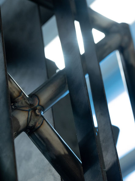 In the second stage of the process, the chassis was brought to life through the implementation of a system of primary (blue) and secondary (grey) jigs. These fixtures were utilized to ensure precise alignment between the tubes while also holding the previously constructed faces in place. This approach resulted in a stable and highly accurate assembly. Notably, the chassis was constructed in three steps at this stage, with the middle three images showcasing the backward growth of the structure. This method allowed welders to access challenging joints with greater ease and efficiency.